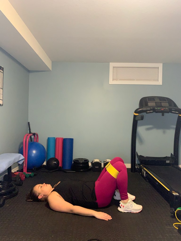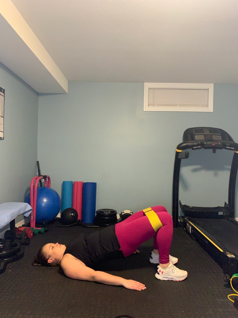Begin by laying on your back on the floor with a loop band positioned around your thighs above your knees. Begin the movement by lifting your hips towards the sky keeping your core active and driving evenly through your feet. Keep tension through the band as you lift up by pressing your knees out slightly against the band. Your core and glutes should be active through the movement and you should feel a glute squeeze at the top of the movement. Ensure that you fully extend through the hips, but avoid arching in the low back when you do this. At the top of the movement press your knees out against the band and return to the initial bridge position in a controlled manner. At the end range of motion return in a controlled manner to the floor.