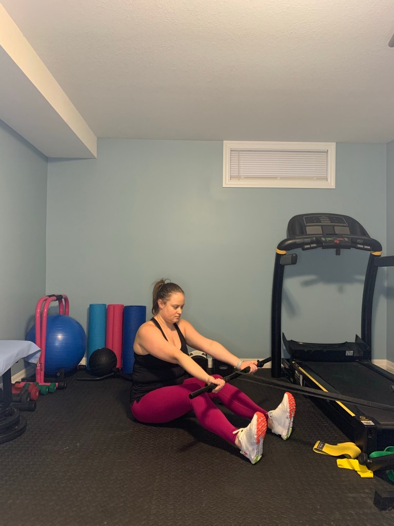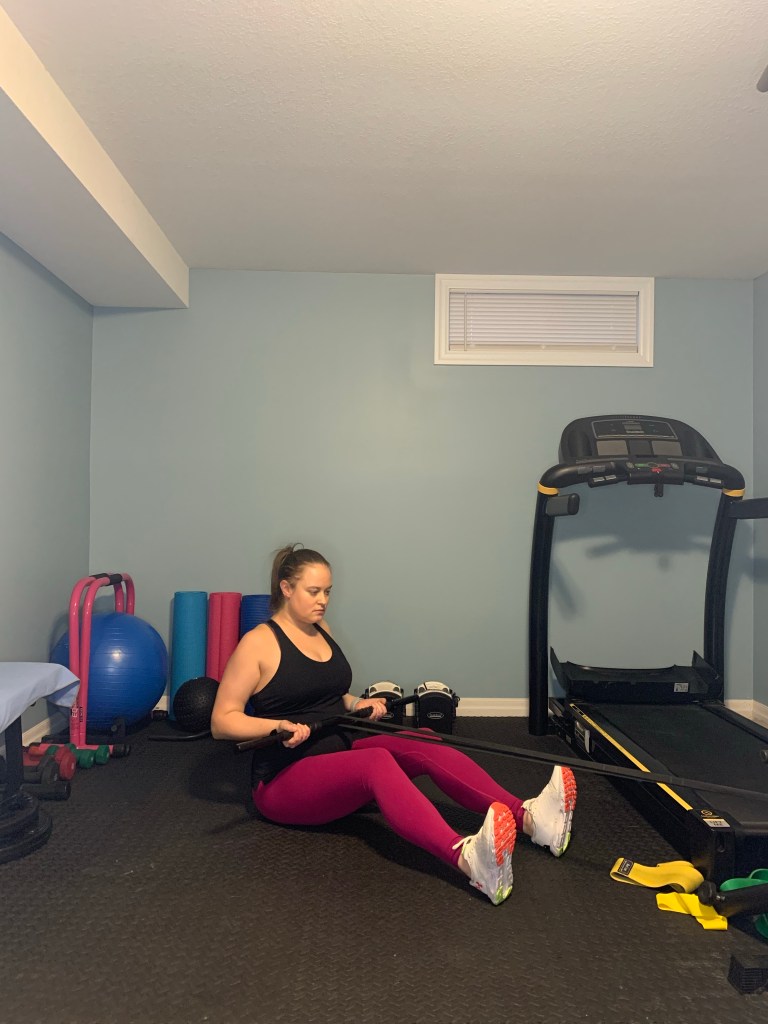 Anchor the band securely to something study. Take the band in your hands while seated on the floor or on a bench with your knees slightly bent. Pull your elbows straight back along your side pulling the band towards your belly button. Squeeze your shoulder blades together at the end range of motion. Return to the start position in a controlled manner