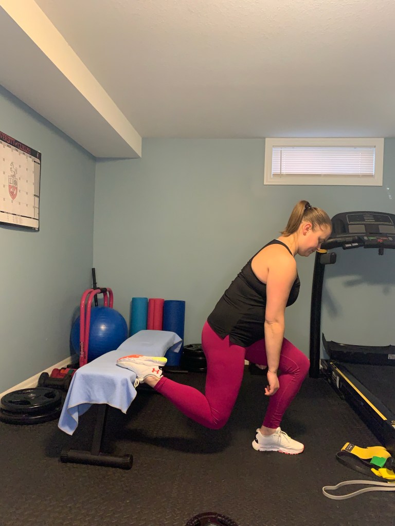 Place one foot on a bench or an elevated surface behind you. Take a dumbbell in the same hand as the foot that is behind you. Place the other foot on the floor. Bending the back knee towards the floor and your front knee lower into a lunge position allowing yourself to lean forward slightly as you drop. The goal is to reach a 90 degree angle at the front knee, however you may not have that range of motion at first (do what you can and focus on striving for the 90 degrees). At the end range of motion drive evenly through your front foot to return to standing and your start position.
