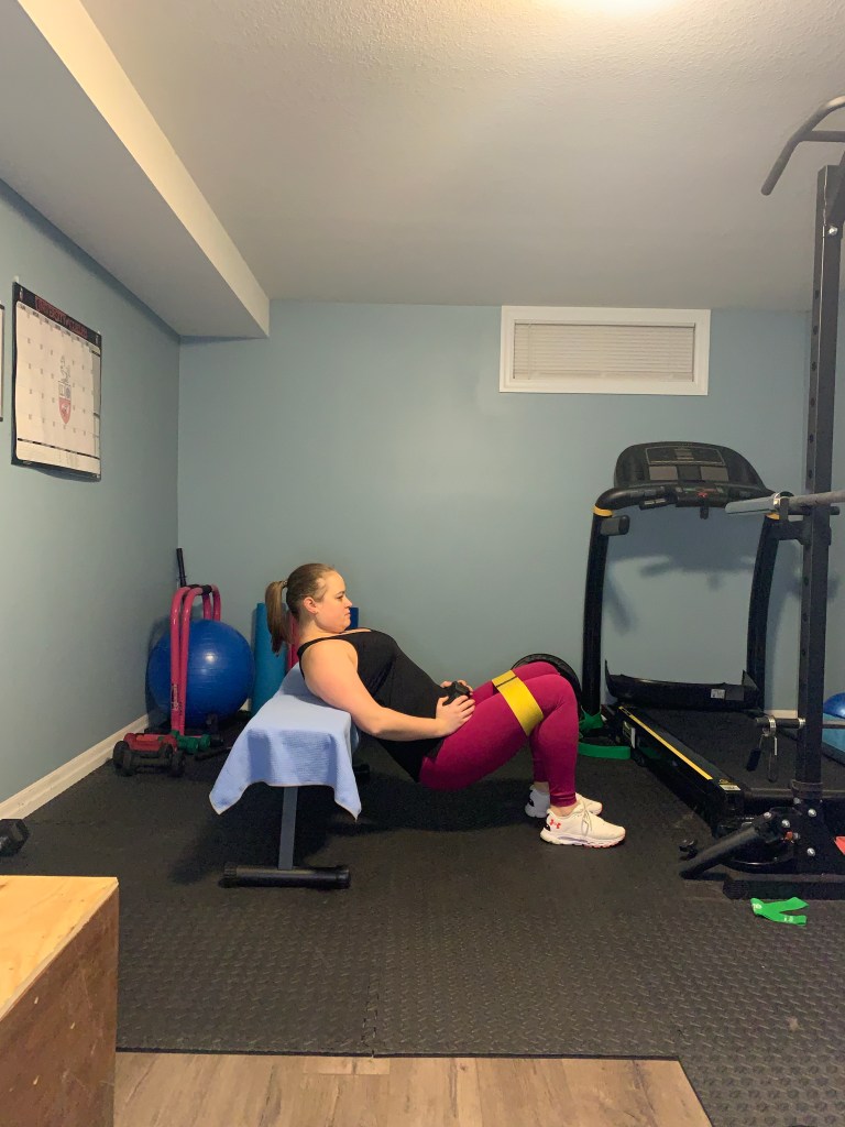 Place just under your shoulder blades on a bench behind you and bring a dumbbell to your hips and a band around your thighs. Place your feet in a position so that when your hips are fully extended your knees are over top of your hips. Beginning from the bottom of the movement your butt will be close to the floor. Squeeze through the glutes and extend through the hips to generate a table top position at the top of the movement. Keep your feet flat on the floor throughout the movement. At the top of the movement squeeze the glutes and then slowly lower your hips back to the start position in a controlled manner.