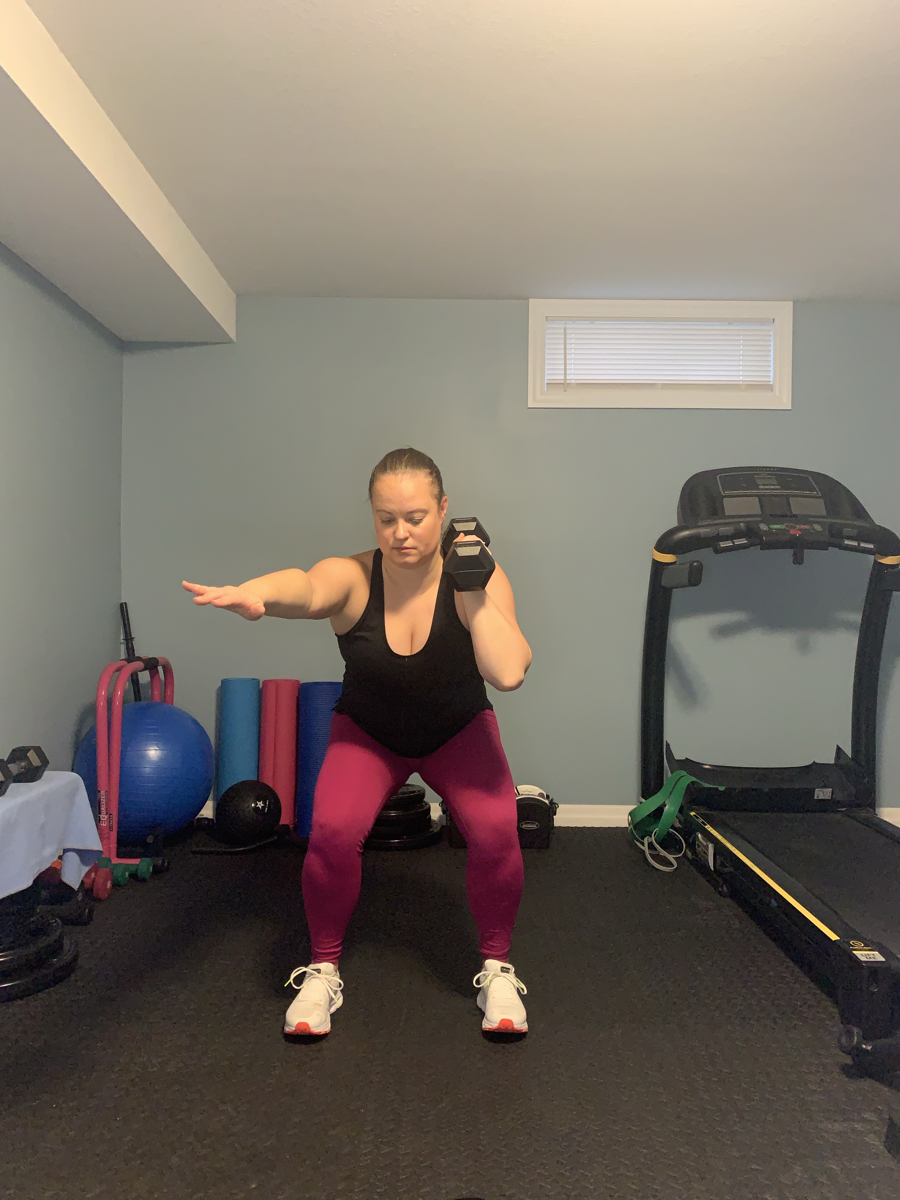 Taking one dumbbell in one hand raise it up to your shoulder while keeping your elbow high with your feet shoulder to hip width apart. Reach your hips backwards like you are reaching your butt back towards an imaginary chair behind you. Keep your weight evenly distributed throughout your feet. Aim to get your thighs parallel with the floor or a 90 degree bend at the knee (not everyone will be able to get this initially and that’s okay, if you don’t have it yet just ensure you are focusing on range of motion when you practice your squatting movements). Ensure that you keep your chest high as you drop down into position. You can use your hand without a dumbbell in it for additional balance by holding it out in front of you as needed. At the bottom of the movement, drive through your feet evenly and stand back up to your start position. Complete all reps on one side and then switch the dumbbell to the other side.