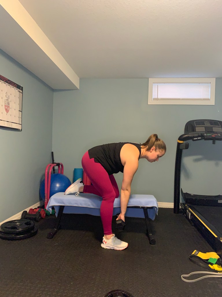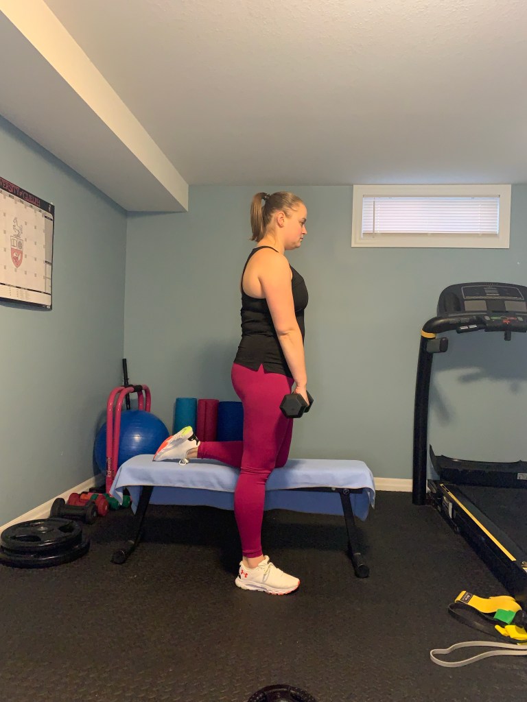Standing beside a bench place your knee and your shin on the bench taking a dumbbell in the hand of the foot that remains on the floor. Keeping your weight through the foot on the floor stand tall with a slight bend in your knee and your weight over that foot. Drive your hips backwards keeping your leg relatively straight and avoid rounding in the spine and shoulders. The bottom range of motion will vary for everyone, but most people will want to stop just below their knee (if you have perfect form and want to go further go for it). At the bottom of the movement squeeze the glutes and drive the hips forward to stand back up and return to the start position.