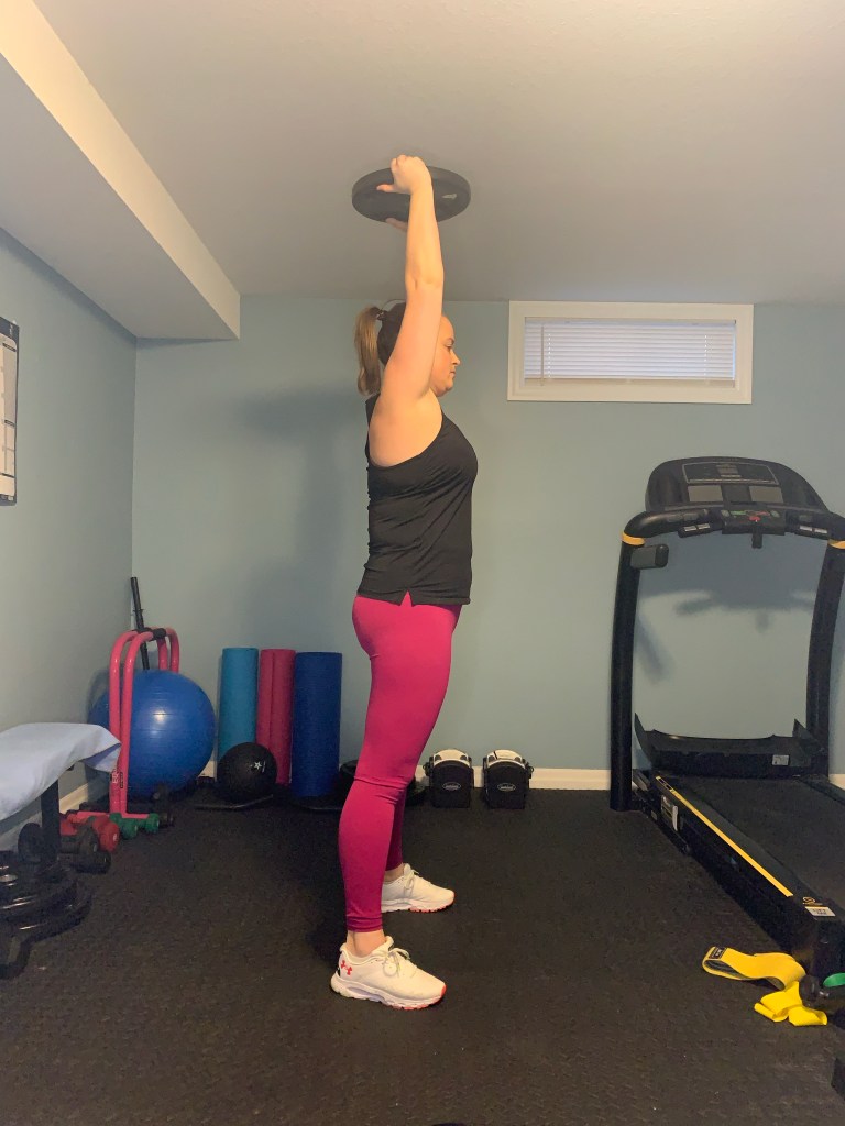Begin standing tall with your feet hip to shoulder width apart and a plate held between your two hands. By driving your hips backwards in a hip hinge motion, move the plate towards the floor tapping the edge of the plate on the floor at the bottom of the movement. Engage in the glutes and hamstrings to return to a standing position while pushing the plate up over your head. You will end with the plate straight up over your head. Begin to lower the plate from over your head to return to the initial movement and repeat for desired reps.