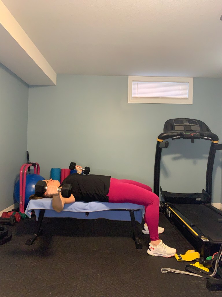 Lying on a bench ensure that you have positioned the safety bars appropriately. If you rest the barbell on the safety bar it should not be crushing your chest (this is the best way to set up your bench press when you don’t have anyone to spot you). You can also leave the clips off the bar of you need to bail out of the lift. Lying under the bar reach up and grasp the bar at a comfortable distance (typically outside of shoulder width). Lift the bar off the J hooks and position it straight over your chest. Bending at the elbows lower the bar towards your chest keeping your elbows from flaring wide out to the side. At the bottom of the movement push the barbell away from your chest to the start position with full extension of the elbows (you don’t need to lock your elbows at the top).