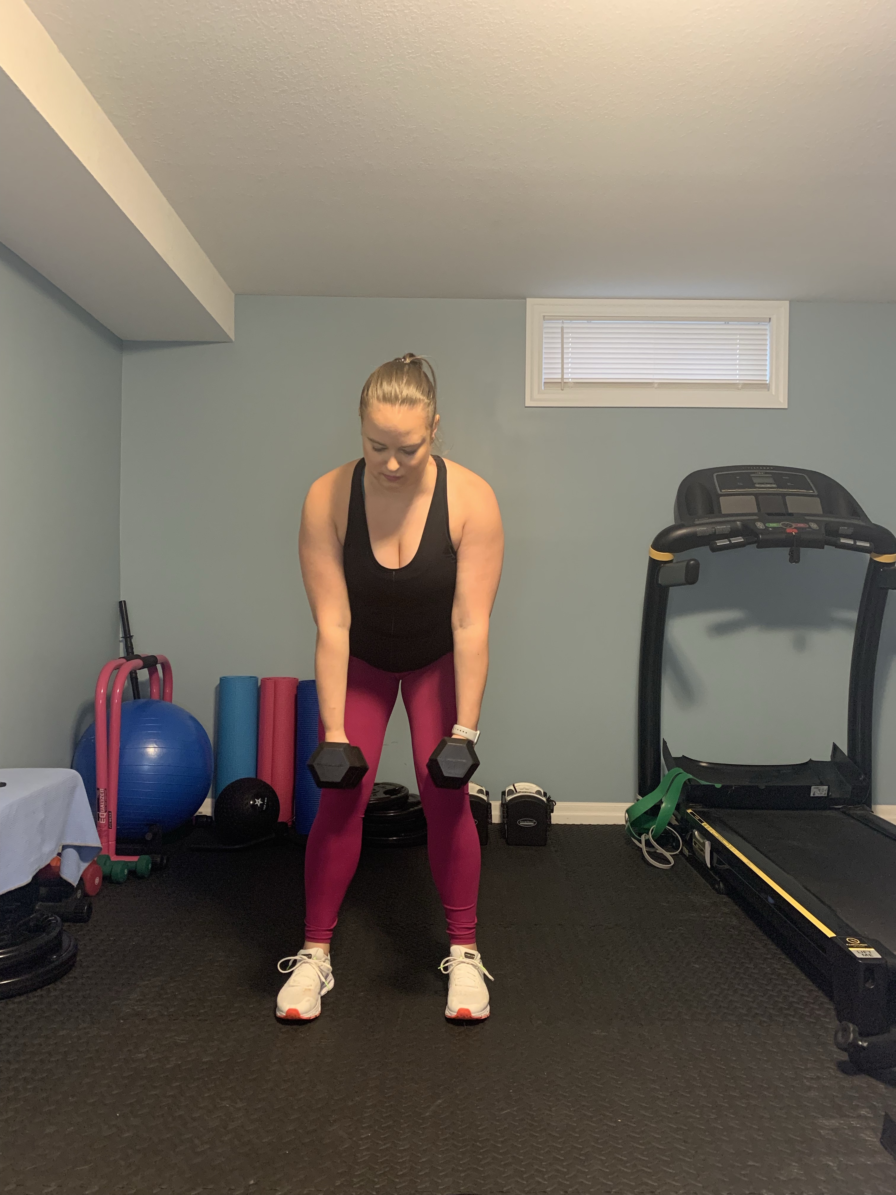 Begin with your feet hip to shoulder width apart with a dumbbell in each hand. Start by bending forward at the hips keeping your spine neutral and your core tight. With a slight bend in the elbows open the dumbbells out to the side squeezing the shoulder blades together at that top of the movement. Lower the dumbbells back to your start position in a controlled manner.