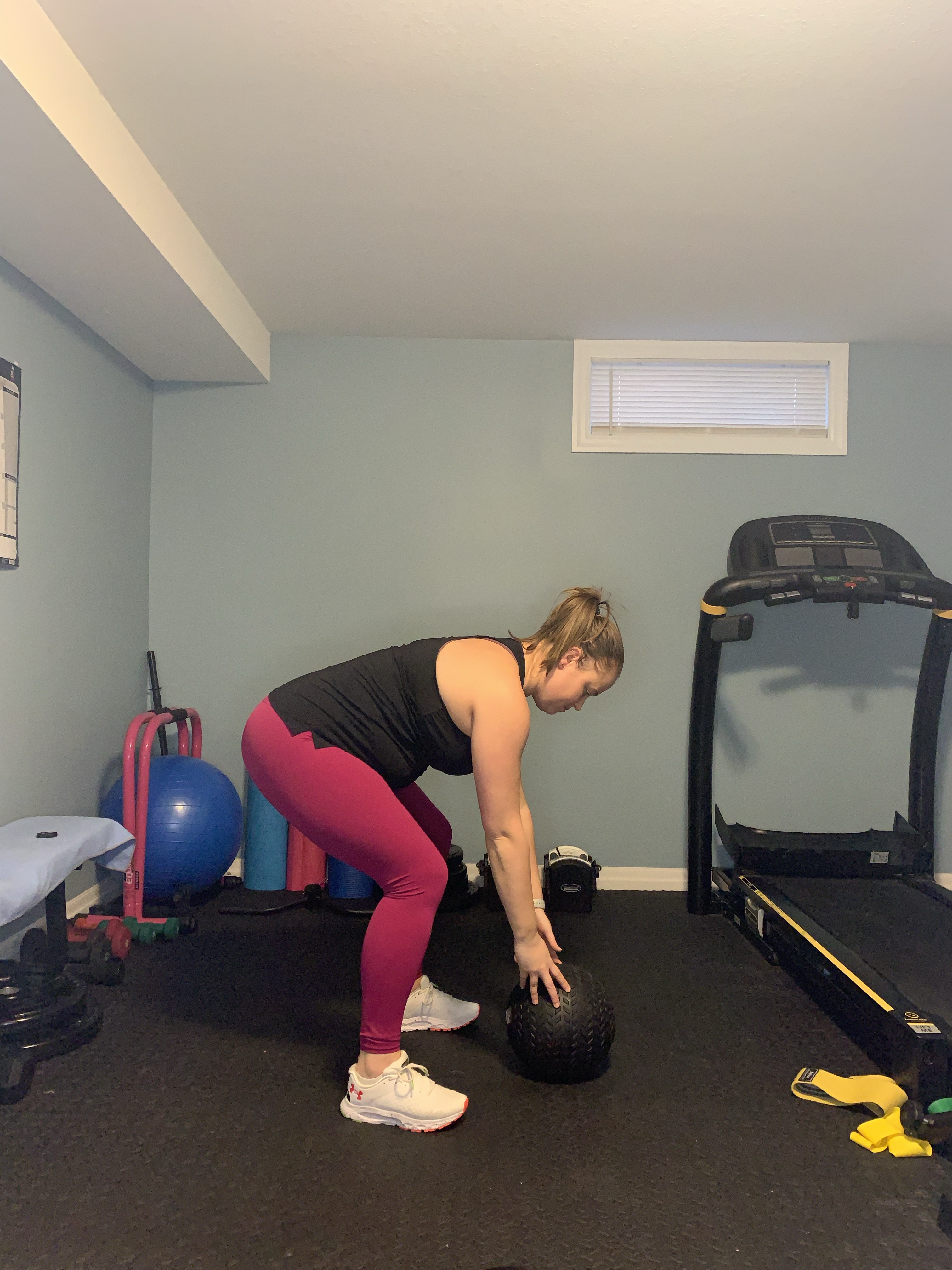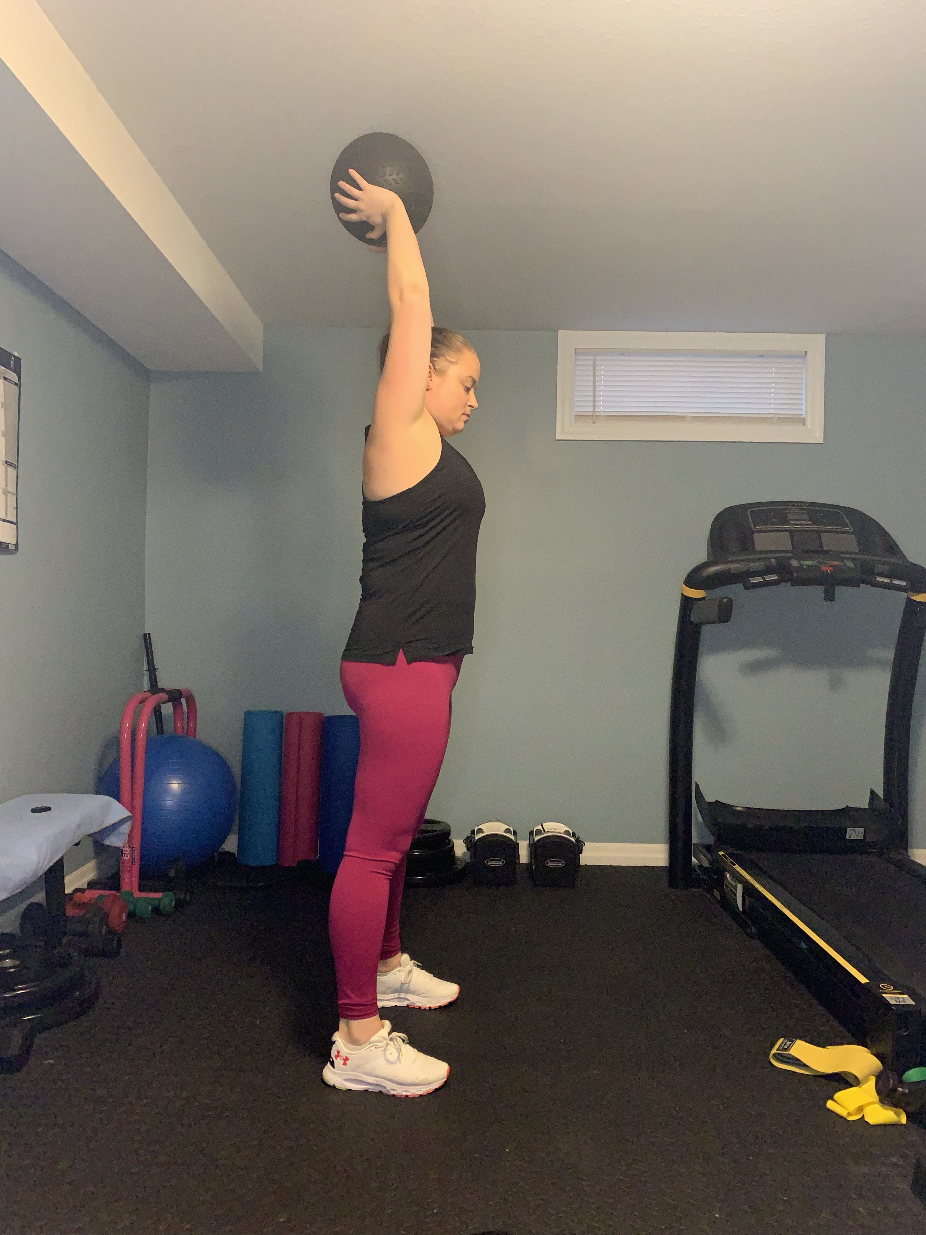 Begin with a slam ball on the floor in front of you with your feet hip to shoulder width apart. Bending through the knees using a squatting motion bend down to pick up the slam ball with both hands. Stand all the way up by extending through the knees as you raise the slam ball over your head. At the top of the movement you should be standing tall with your arms straight above your head. Drive your hips back and bring the slam ball down towards the floor with as much force as you can (you should feel like you are slamming it at the floor). Once the ball is back on the floor you can return to the top of movement and repeat for desired reps or time.